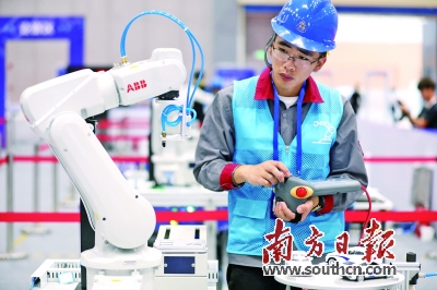 2019年10月,广东省职工工业机器人职业技能竞赛决赛在佛山举行,120名机器人开发设计与应用高手拼技能。省总工会供图