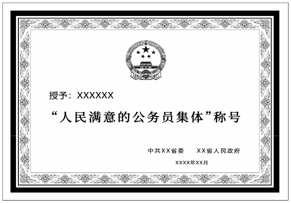 本证书适用于对公务员、公务员集体的奖励。证书规格为410×290毫米(展开)。封面选用国旗红色丝绸材料,烫金印制国徽图案及“公务员奖励证书”字样,字体为魏碑,54号字,国徽图案规格为80×84毫米。内页为硬卡纸,浅黄色,金色波浪底纹,周边配以缠枝纹图案。左侧印制国徽图案,规格为75×80毫米。右侧为正文,其中左上部分为获奖单位或个人名称,中间部分为受到何种奖励,右下部分为颁奖单位名称、印章和颁奖日期。