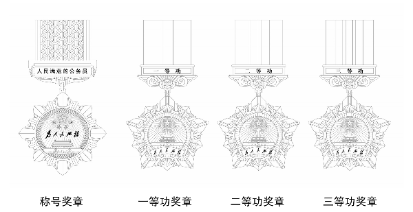 一、二、三等功奖章由铜压制成型,分别采用镀金、银、铜工艺。核心区上部为五星图案;中部为天安门图案;下部为毛泽东同志书写的“为人民服务”字样,采用红色填釉工艺;核心区周围由内及外分别为齿轮和绸带图案;外圈为五角光芒;上章镌刻奖项名称,分别标明一、二、三等功,采用红色填釉工艺。奖章背后标明监制机关名称。绶带为丝质,大红色,分别用一条、二条、三条明黄色竖带代表一、二、三等功。绶带可拆卸,上章背后设有别针,奖章可采取领绶、襟绶两种佩戴方式。